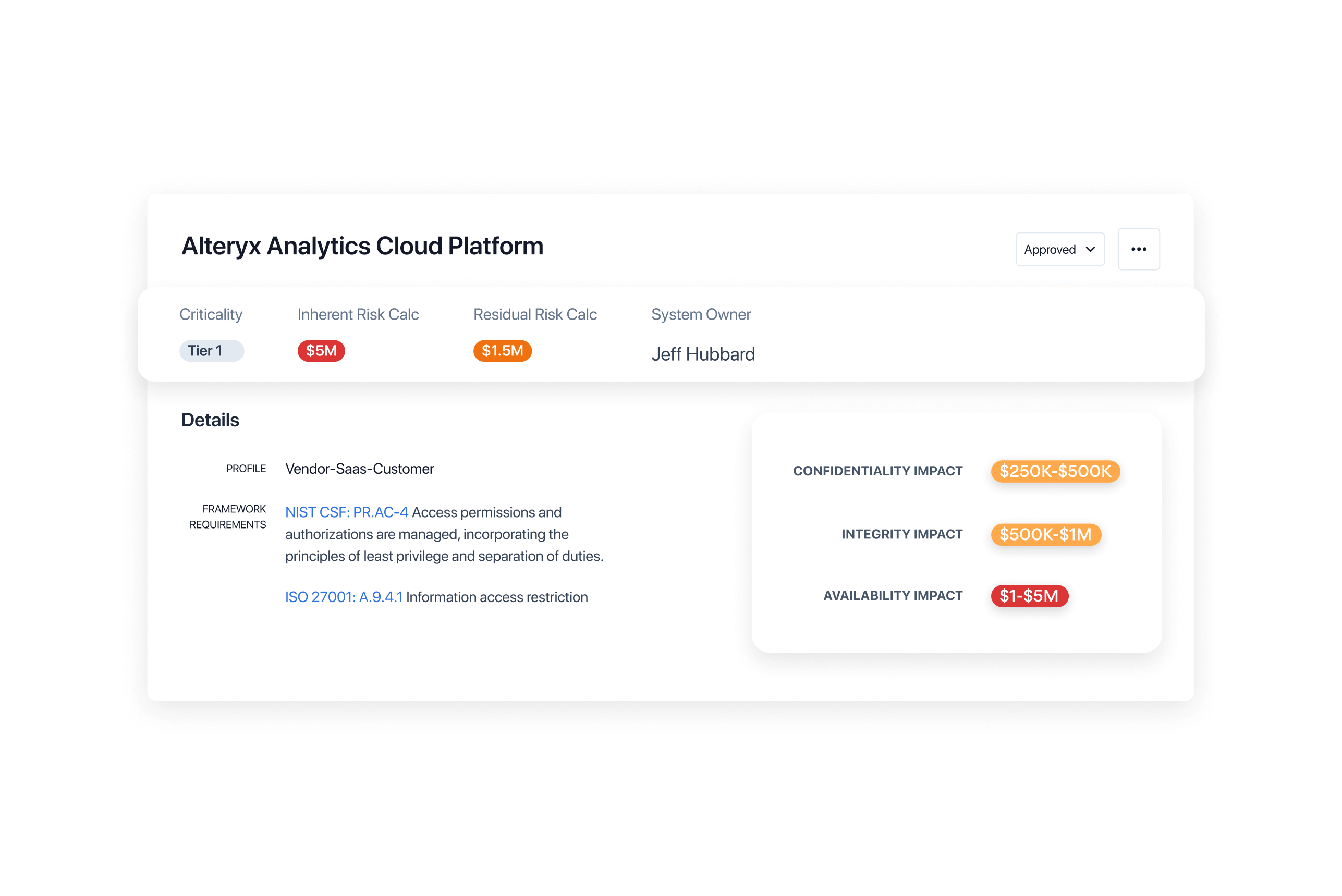 Empower risk owners to identify new IT assets through streamlined workflows and perform business impact assessments at the asset level. Create a centralized location for assets and profile them by data classification, criticality, and type.