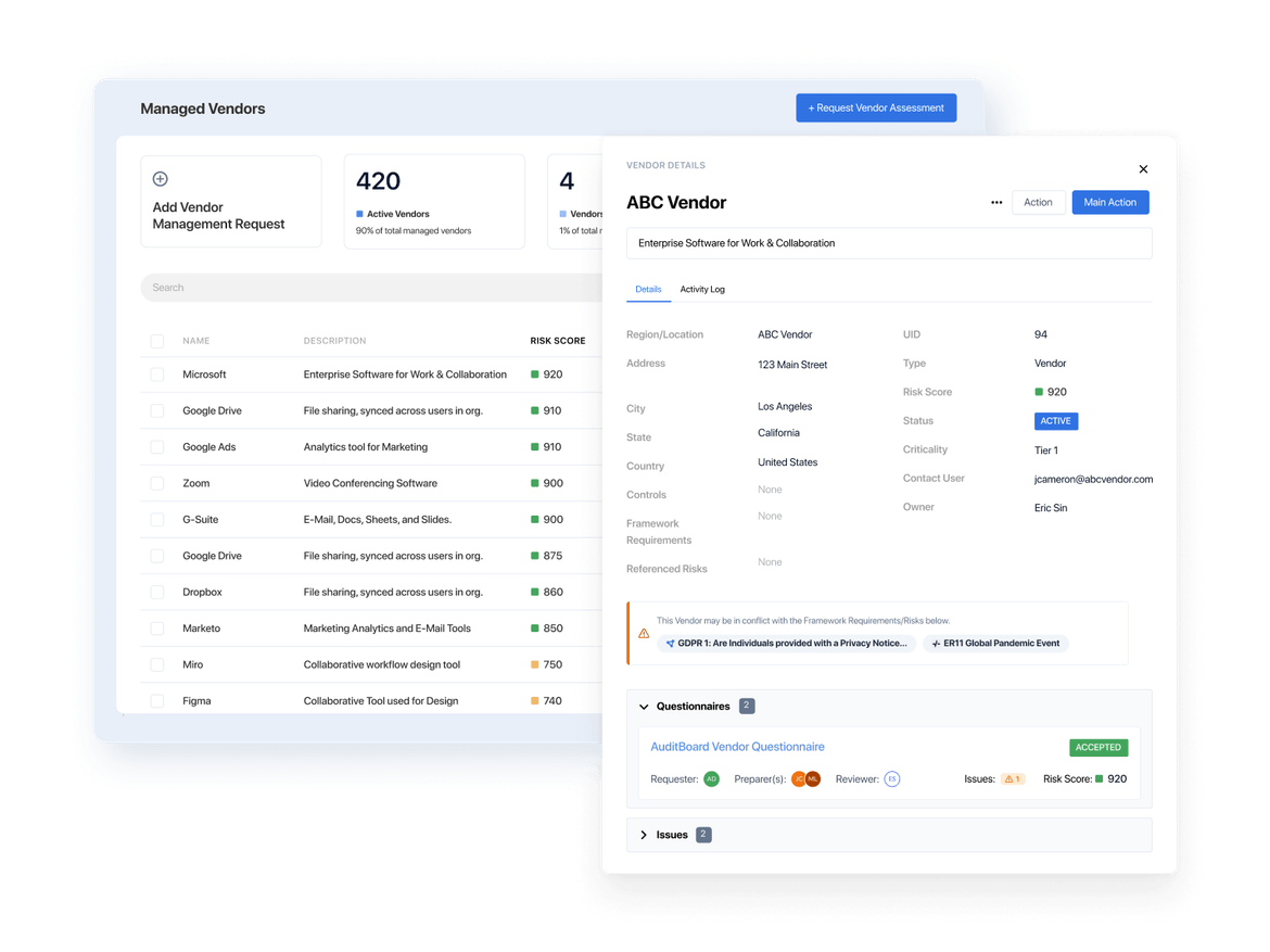 Accelerate the vendor risk management process with automated workflows for sending and reviewing questionnaires and creating issues. Build a centralized inventory to deliver a comprehensive view of your 3rd party ecosystem, allowing you to focus on the partners that matter most with auto-inherent risk scores.