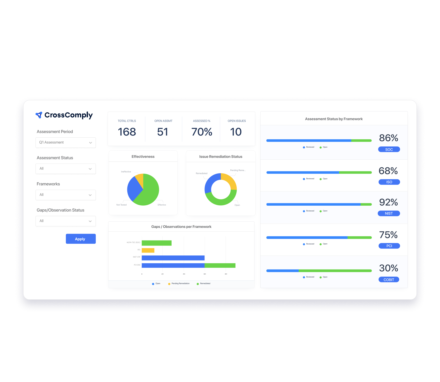 Execute gap assessments, audits, and manage multiple frameworks and scopes with a platform built to meet the compliance needs of your growing business.