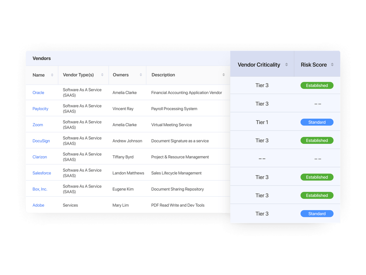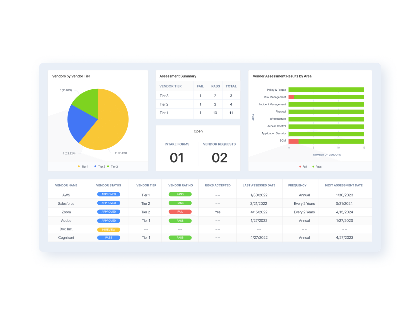 Enable ongoing monitoring of your vendor’s risks, changes to their control environment, and provide timely updates to management using dynamic dashboards.